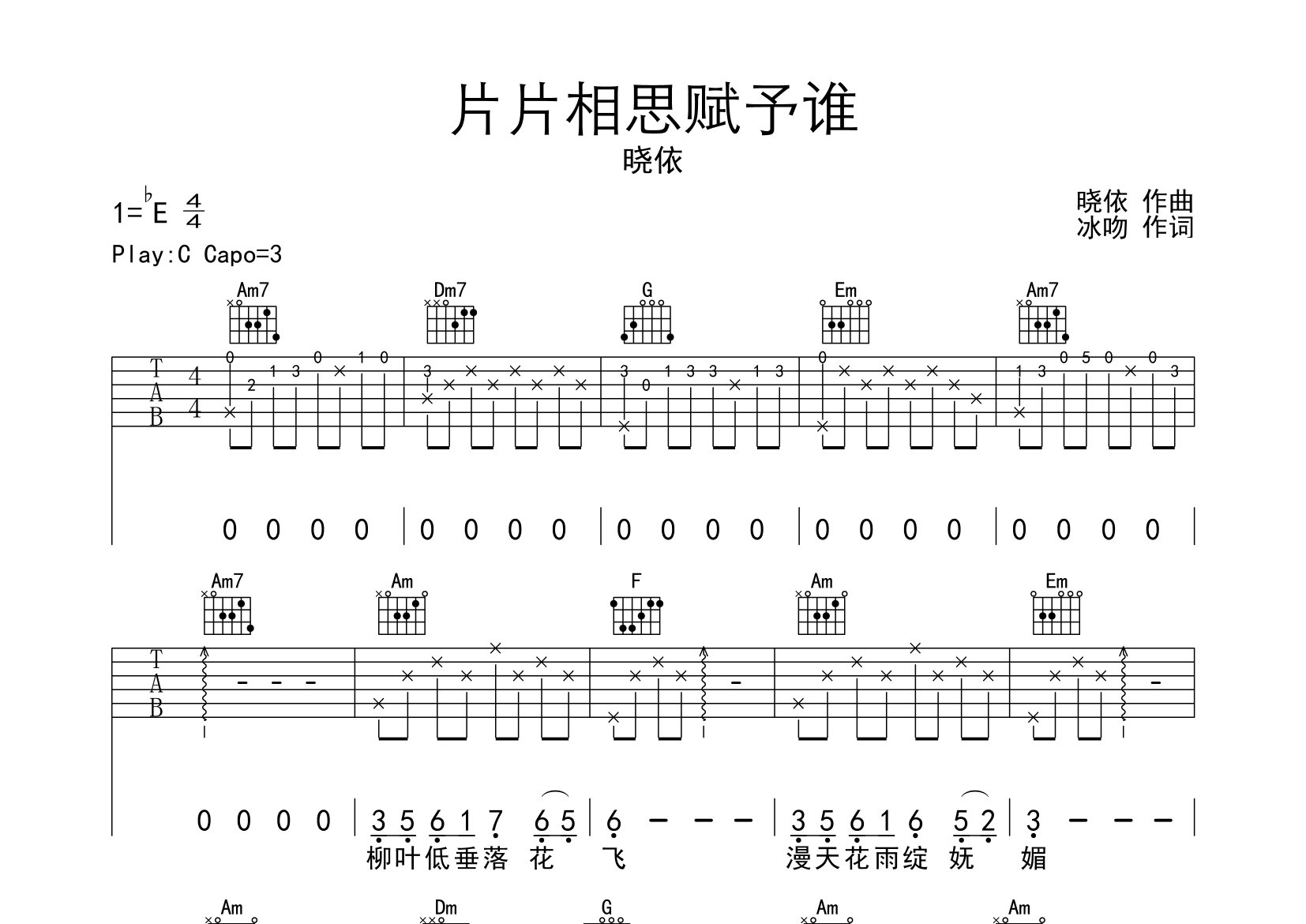 片片相思赋予谁吉他谱,晓依的一首歌,歌曲为4/4拍的节奏,选用C调和弦进行编配,弹奏时变调夹3品即可保持与原曲一样的调式降E调,当然也可以根据实际情况自己微调变调夹品数。《片片相思赋予谁》吉他弹唱谱完整曲谱共3张图片六线谱,由025吉他网上传。