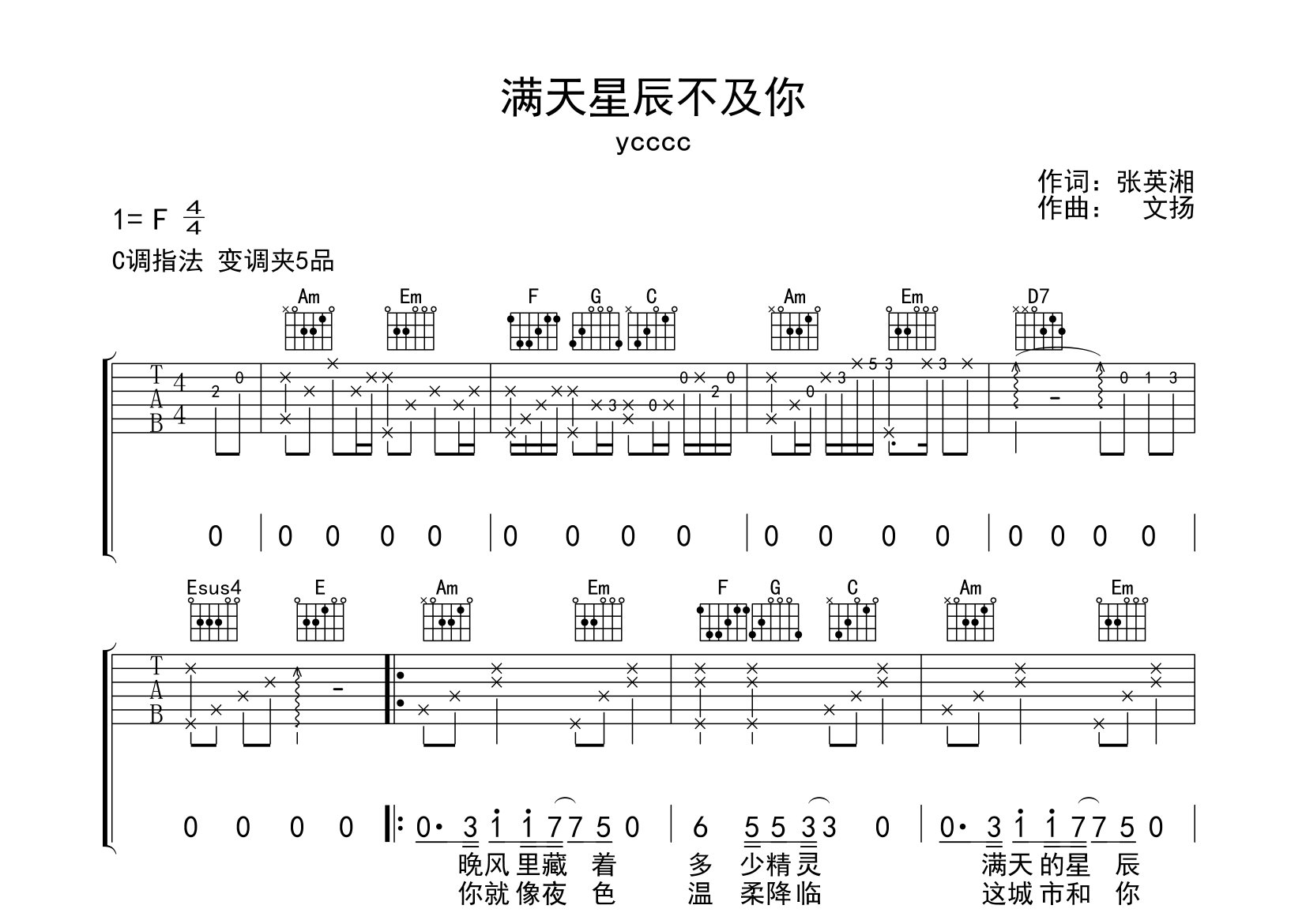 满天星辰不及你吉他谱,ycccc的一首歌,歌曲为4/4拍的节奏,选用C调和弦进行编配,弹奏时变调夹5品即可保持与原曲一样的调式F调,当然也可以根据实际情况自己微调变调夹品数。《满天星辰不及你》吉他弹唱谱完整曲谱共3张图片六线谱,由025吉他网上传。